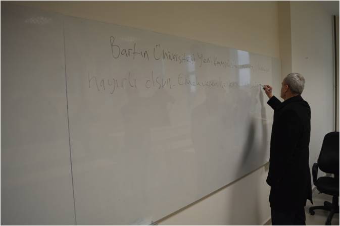 Yeni kampüsteki derslikleri ve amfileri gezen Bartın Valisi Nusret Dirim de Kutlubeyyazılar Kampüsü’nün artık Bartın Belediyesinin mücavir alanı içerisinde yer aldığını açıklarken Mehmet Akif Ersoy Dersliği’ndeki bir amfideki tahtaya “Bartın Üniversitesi yeni kampüsü Bartın’a, ülkemize ve milletimize hayırlı olsun.” Yazdı.