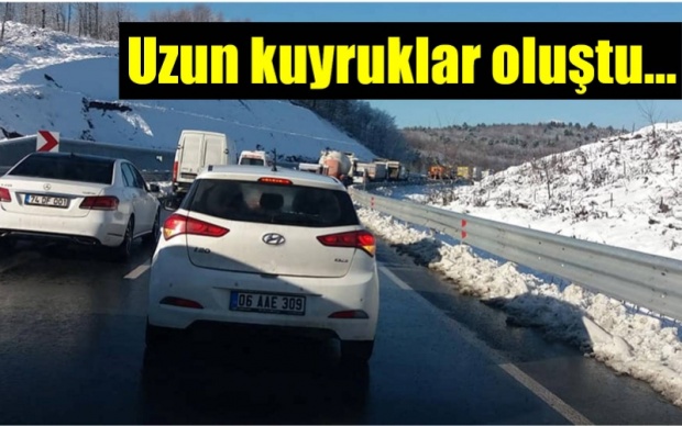 Uzun araç kuyruklarının oluştuğu yolda araç sürücüleri ve yolcular yaklaşık yarım saat boyunca yolun trafiğe açılmasını bekledi.