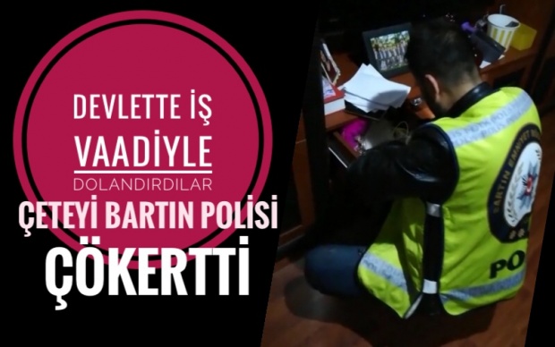 Bartın Asayiş Şube Müdürlüğünce işsiz vatandaşları hedef alan dolandırıcılar kendilerinin önemli kamu kurum ve kuruluşlarında çalıştıklarını ve çeşitli kurumlara işçi-memur alımında yetkili olduklarını söylediler.