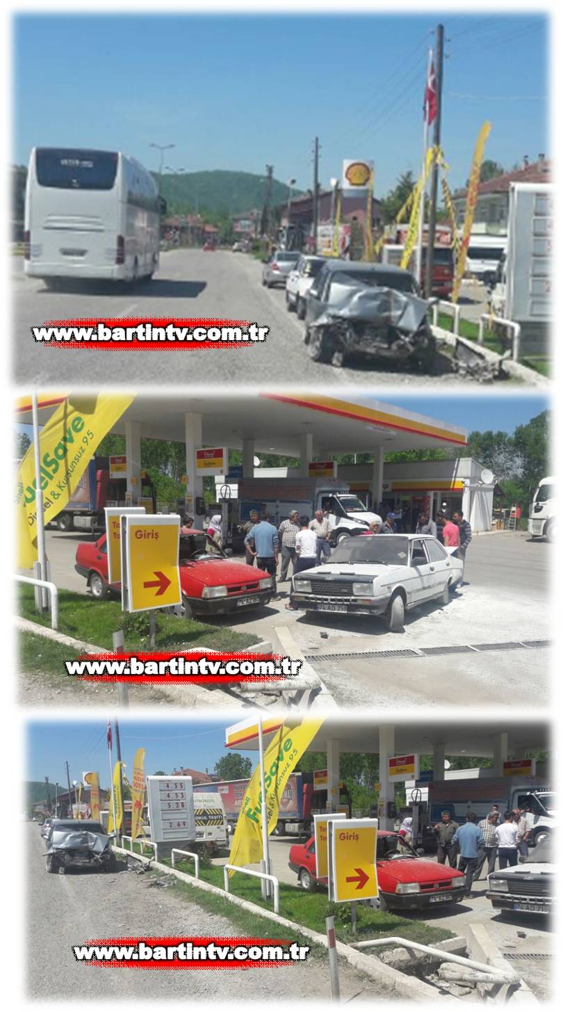 İki aracın çarpışması sonucu oluşan kazada benzin istasyonu içerisinde park halinde olan bir başka aracında camı kırıldı.
