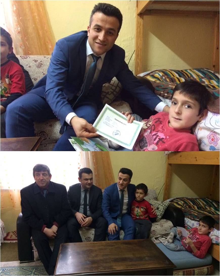 Ulus İlçe Milli Eğitim Müdürü Levent Ok beraberinde Sosyal Yardımlaşma ve Dayanışma Derneği Ulus İlçe Müdürü Uğur Ünal, Ulus Hasandede İlkokulu Müdürü Remzi Çelik ve Öğretmeni Nazif Ozan’la birlikte Gürüz’ün yaşadığı eve giderek karne sürprizinde bulundular.
