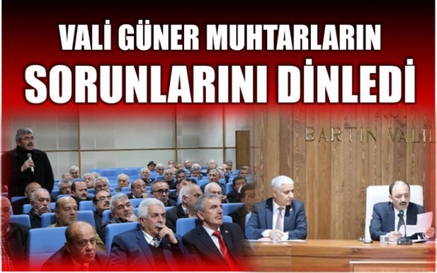 Bartın'la ilgili çeşitli konuların değerlendirildiği, merkeze bağlı köy muhtarlarının sorunlarının masaya yatırılarak çözüm önerileri konusunda karşılıklı görüş alışverişinde bulunulduğu toplantıda muhtarların, vatandaşın devlete en yakın kapısı olan kişiler olduğunu ifade eden Vali GÜNER “Muhtarlarımıza her daim kapılarımız açık. Devletimizin imkanları ölçüsünde köylere daha iyi hizmet götürmek için var gücümüzle çalışıyoruz ve çalışmaya da devam edeceğiz.” dedi.